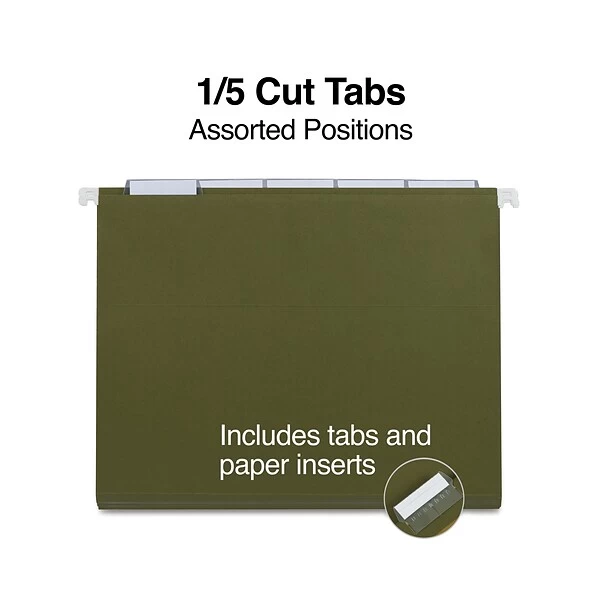 Organize your company file cabinet with efficient Quill Brand hanging file folders. These 1/5-cut file folders are made from 100 percent recycled materials.