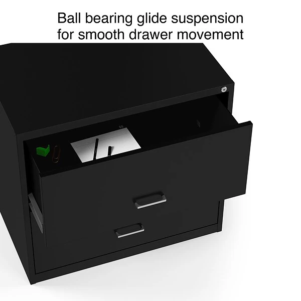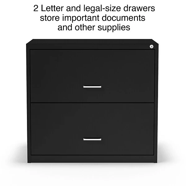 Organize your home or small office with the 2-Drawer light duty lateral file cabinet. Keep all your letter/legal-sized documents secure and tucked away in two 30” width drawers. Great compact style is ideal for smaller work spaces. This file cabinet comes equipped with one factory installed lock and key, controlling both drawers for peace of mind and security. The sleek black finish and polished handles keep your office space looking contemporary and organized. This cabinet is backed by a 7-year limited warranty, keeping you satisfied for years to come.