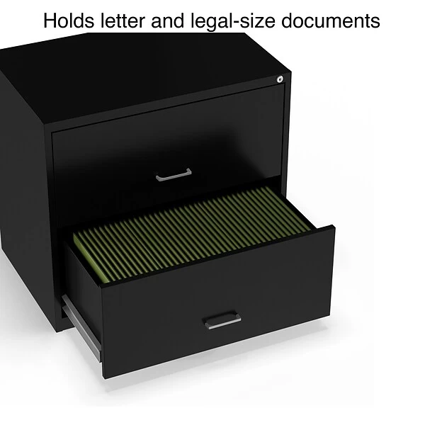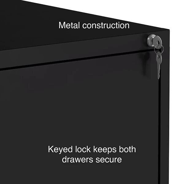 Expand your business filing system with this light duty lateral file cabinet. Two generously sized drawers offer ample space for organizing and storing paperwork, while the keyed lock keeps sensitive paperwork stored securely inside. The durable metal construction stands up to frequent use in your home office or smaller professional workspace. Each drawer accepts letter-size file folders, so you can store a wide range of documents in this black two-drawer file cabinet.