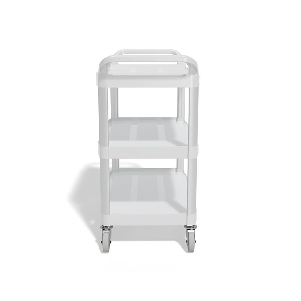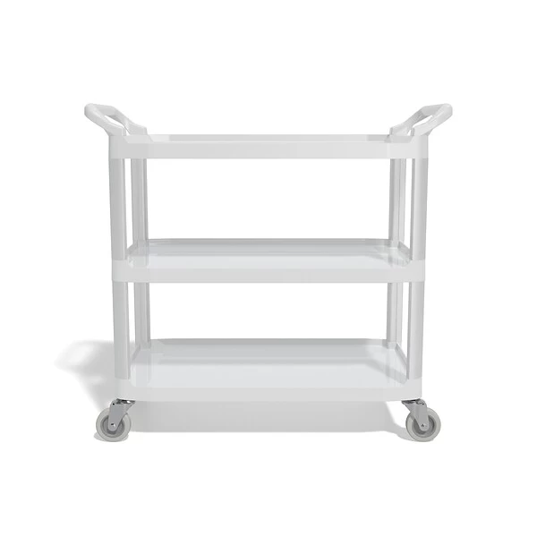 Move tools and supplies throughout the building or office with this gray utility cart. The three shelves let you easily organize and store items, while the plastic construction stands up to long-term use. An open design allows easy access to the contents inside. This Coastwide Professional utility cart features three wheels and swivel casters for hassle-free mobility and withstands up to a 600-pound weight capacity to keep up with heavy supplies.