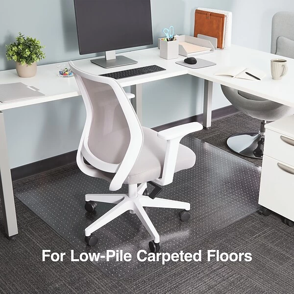 Extend the life of your low pile carpet (up to 3/8″ thick including padding depth) by protecting against chair caster wear and tear. The perfect addition to your workspace, this chair mat provides a smooth surface that enhances ergonomic comfort by allowing your rolling office chair to move freely. Easy to handle, this chair mat features rounded AnchorBar cleats (studs) that hold your mat in place and are gentle on carpets and fingers (no sharp spikes). This chair mat is made with durable vinyl that is GREENGUARD Gold Certified for low chemical emissions to promote a healthier workspace. Designed for use on carpeted surfaces only, do not use on hard floors.