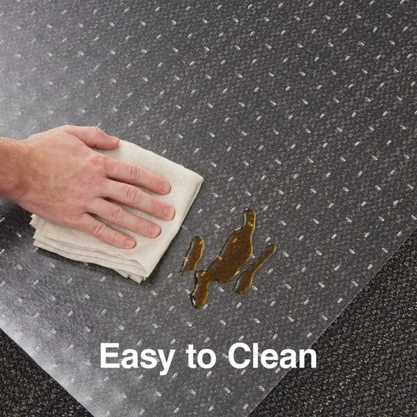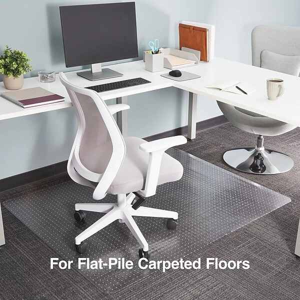 Extend the life of your flat pile commercial carpet (up to 1/8″ thick including padding depth) by protecting against chair caster wear and tear. The perfect addition to your workspace, this chair mat provides a smooth surface that enhances ergonomic comfort by allowing your rolling office chair to move freely. Easy to handle, this chair mat features rounded AnchorBar cleats (studs) that hold your mat in place and are gentle on carpets and fingers (no sharp spikes). This chair mat is made with durable vinyl that is GREENGUARD Gold Certified for low chemical emissions to promote a healthier workspace. Designed for use on carpeted surfaces only, do not use on hard floors.