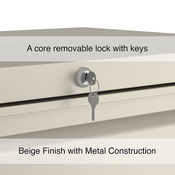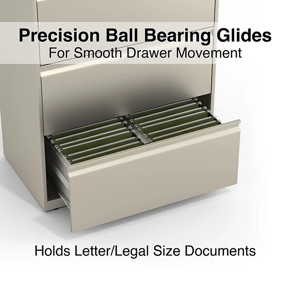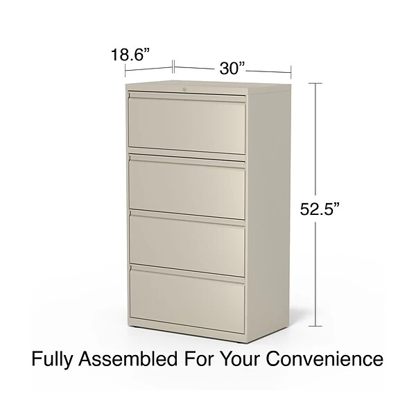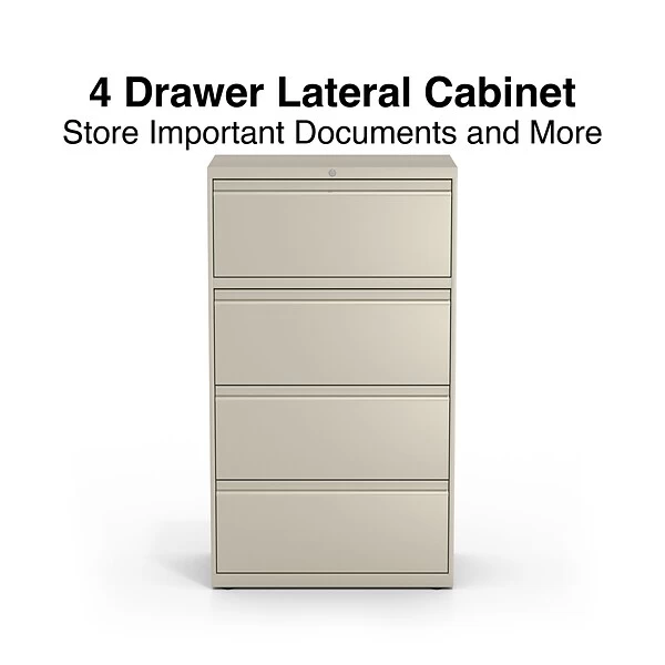 Get a durable, high-capacity solution for document and record storage with this four-drawer commercial lateral file cabinet. This cabinet easily accommodates large numbers of letter and legal-sized files with four 30-inch-wide drawers and offers easy access to stored materials with ball-bearing slide suspensions and wide drawer pulls. The built-in lock makes it easy to secure stored documents, perfect for managing access to sensitive materials. This putty commercial lateral file cabinet offers long-lasting durability with its rugged metal construction and corrosion-resistant enamel finish.