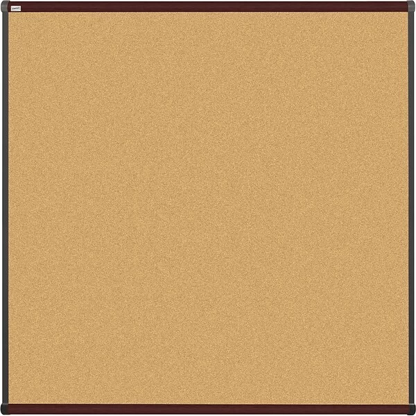 The cork bulletin board with a mahogany frame features a 1/16″ recyclable cork layer that is attached to a 7/16″ layer of insulation board that holds tacks securely. This durable bulletin board measures 4′ x 4′ and is ideal for use in workplaces.