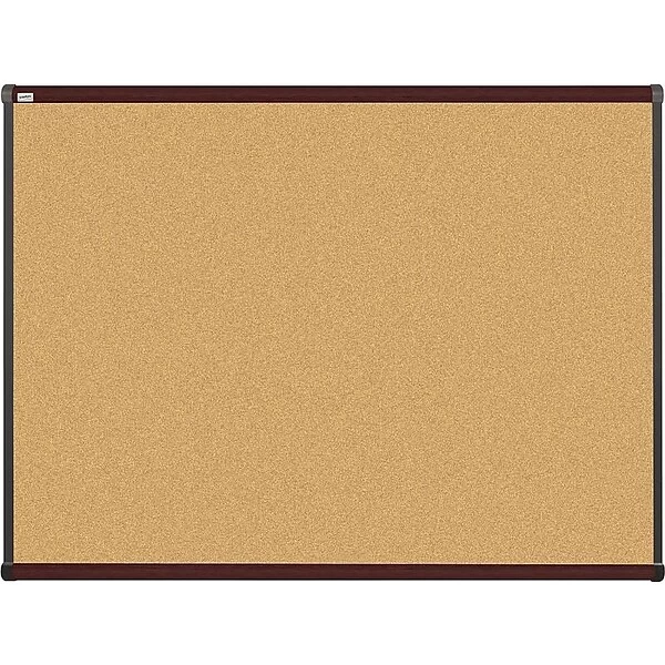 Adorn the wall in your break room, classroom or other work area with this cork bulletin board. The rich mahogany-finish frame adds an executive-level look, while the natural cork withstands regular use. This board works with push pins and thumbtacks, keeping your documents securely in place for easy viewing. A wall-mountable design makes installation quick and simple. With its generous dimensions, this framed bulletin board offers ample room for displaying posters, plain paper and a range of other reading materials.