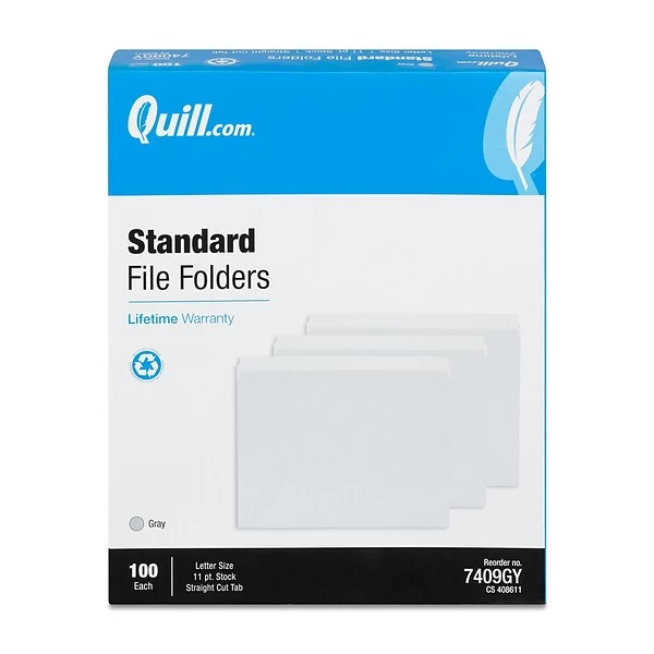Create a color-coded filing system to identify customer, subject, date or region easily with these Quill Brand straight-cut letter-size file folders in gray. This type of system makes it easier to file away folders your staff doesn’t need immediately and quickly grab the correct file when they need it now. The inside of each file is a slightly lighter shade of gray so that you can’t accidentally file them the wrong way.