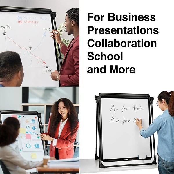 Be ready for impromptu presentations with this whiteboard and easel set, which features a convenient flip chart holder and a reversible melamine whiteboard surface. This easel lets you adjust the height and angle of the surface, which locks in place for easy writing and viewing, and the lightweight aluminum frame collapses for effortless transportation and storage. This double-sided whiteboard and easel also comes with an accessory tray .