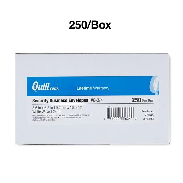 Each Quill Brand security business envelope is made from 24-pound white woven paper for a strong feel that resists tearing and folding while in transit. Whether you’re sending paychecks in the mail or just interior memos, these envelopes stand up to the task.