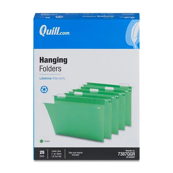Update your filing system with these durable Quill Brand colored hanging file folders. Use the folders for long-term storage — the acid-free material helps prevent paper degradation. Each box comes with 25 folders, so you can stock a supply shelf or distribute folders among individual offices.