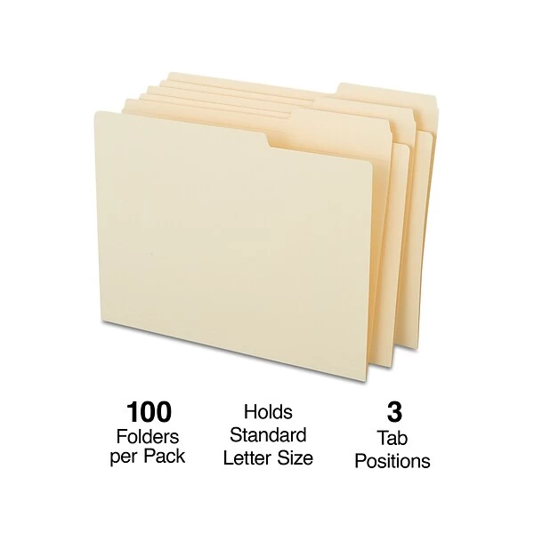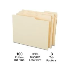 Made from at least 10 percent post-consumer recycled content, these manila folders help your company keep its commitment to using more renewable resources in the workplace. The bulk pack of 100 folders lets you stock up supply closets to keep the team organized and avoid last-minute trips to the store.