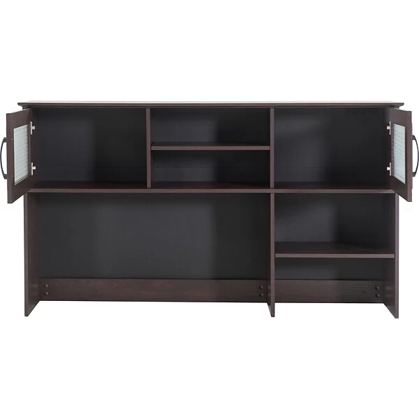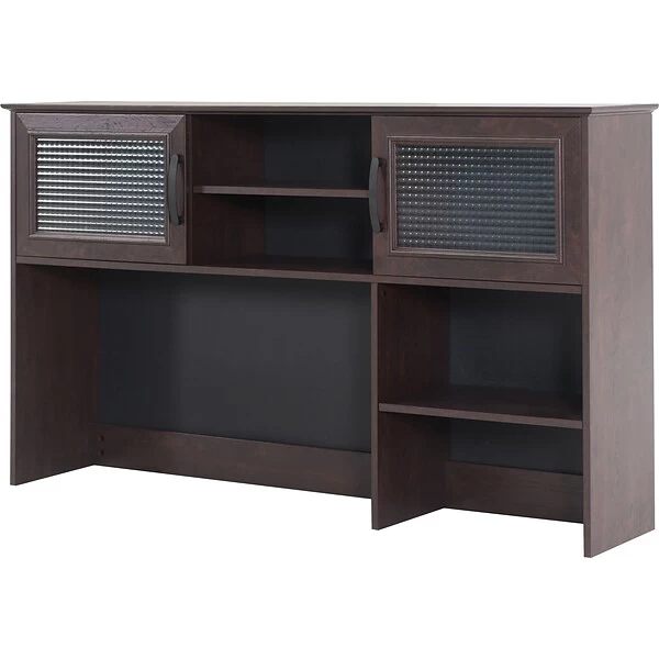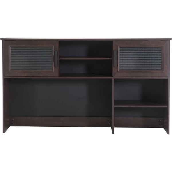 The Quill Brand Kendall Park Hutch is a great addition to the Kendall Park L-Shaped desk. The hutch is designed to fit perfectly with your L-Shaped desk allowing for additional storage space while keeping a cohesive aesthetic in your office. Stay organized with Two additional cabinets and two open shelves for personalization such as picture frames or even more storage. The dark cherry laminate adds timeless style to your workspace and the frosted glass cabinets keep your belongings out of sight.