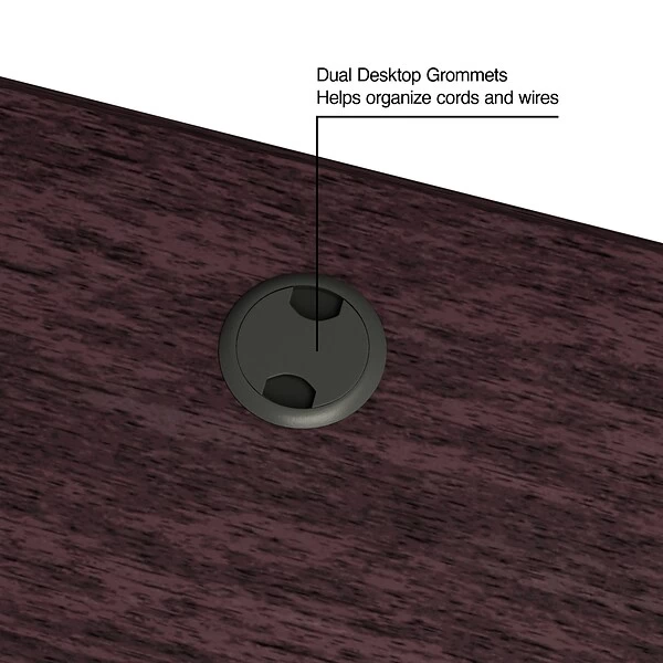 Update your small office or home office with the Quill Brand Kendall Park L-Shaped desk. Enjoy ample storage without compromising precious space. Stay organized with 3 file sized drawers perfect for letter sized documents or use for any other storage needs. Tuck away electronics in the open drawer space for easy access when needed and keep your other office supplies close at hand in two additional drawers. The dark cherry laminate adds timeless style to any small office space. The back of the desk is finished allowing for unlimited options for configuration in your room of choice. Open grommet holes let you pass wires and power cords through, so you can charge devices without experiencing tangled cables on your workspace.