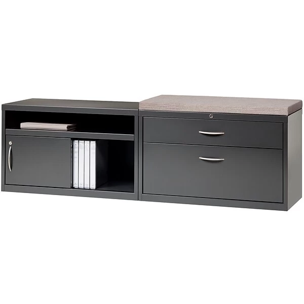Our 36″ Wide Lateral Low Credenza with sliding door. Includes a core removable lock. The sliding door will lock on either side of the unit. Fixed upper shelf with open storage. Meets or exceeds ANSI/BIFMA standards and contains up to 28% recycled material.