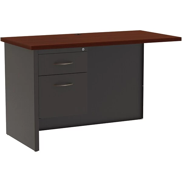 Our Modular Left Pedestal Desk Return for a Right Single Pedestal Desk in Charcoal/Mahogany. Includes a core removable lock. Box and file drawers feature full extension slides and premium satin nickel arch pull handles. Precision ball-bearing suspension. Durable laminate work surface with grommet holes for cord management. Radiused profile edgebanding for enhanced comfort. Full height end panels with leveling glides. One drawer divider standard per box drawer. Meets or exceeds ANSI/BIFMA standards and contains up to 28% recycled material.