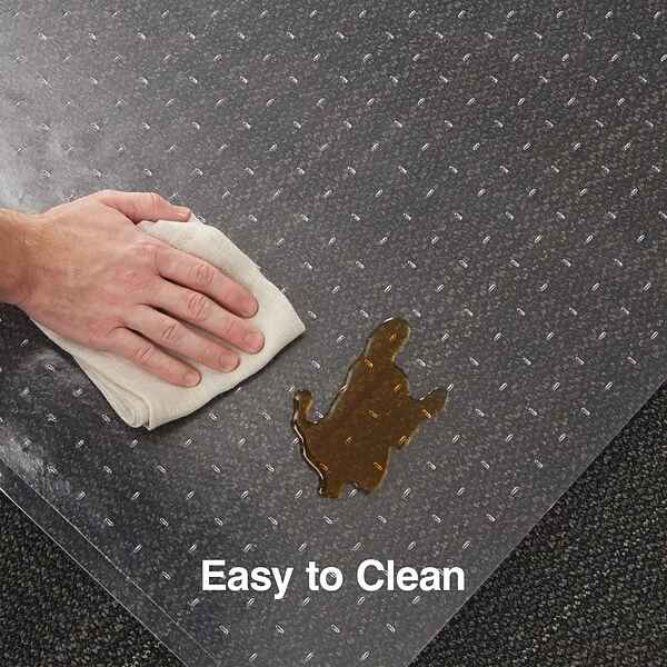 Extend the life of your low pile carpet (up to 3/8″ thick including padding depth) by protecting against chair caster wear and tear. The perfect addition to your workspace, this chair mat provides a smooth surface that enhances ergonomic comfort by allowing your rolling office chair to move freely. Easy to handle, this chair mat features rounded AnchorBar cleats (studs) that hold your mat in place and are gentle on carpets and fingers (no sharp spikes). This chair mat is made with durable vinyl that is GREENGUARD Gold Certified for low chemical emissions to promote a healthier workspace. Designed for use on carpeted surfaces only, do not use on hard floors.