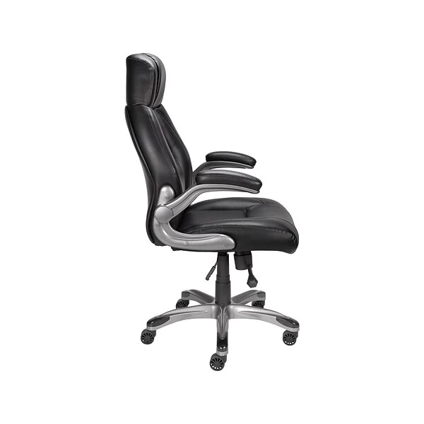 Sit back and relax as you manage your company’s day-to-day operations with this Torrent managers chair. Padded flip-up arms make it easy to get in and out of the thickly padded seat, while built-in lumbar support and a headrest provide added cushion for marathon work sessions. The adjustable tilt tension control and tilt lock make it easy to find the perfect angle of recline, while a pneumatic height adjustment lever lets you move the seat up and down to suit your personal preferences. With soft bonded leather upholstery and a simple silhouette, this Torrent managers chair offers both modern executive style and exceptional comfort.